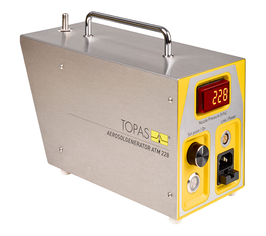 The Topas ATM 228 is the most advanced atomizer aerosol generator at Topas, designed for mobile use with integrated compressor and optional battery operation. It excels at producing test‐ and calibration aerosols from pure liquids, solutions, or suspensions with high stability—even at very low particle production rates and low nozzle volume flows. It meets all requirements of VDI 3491 2 as well as relevant cleanroom and filter test standards.